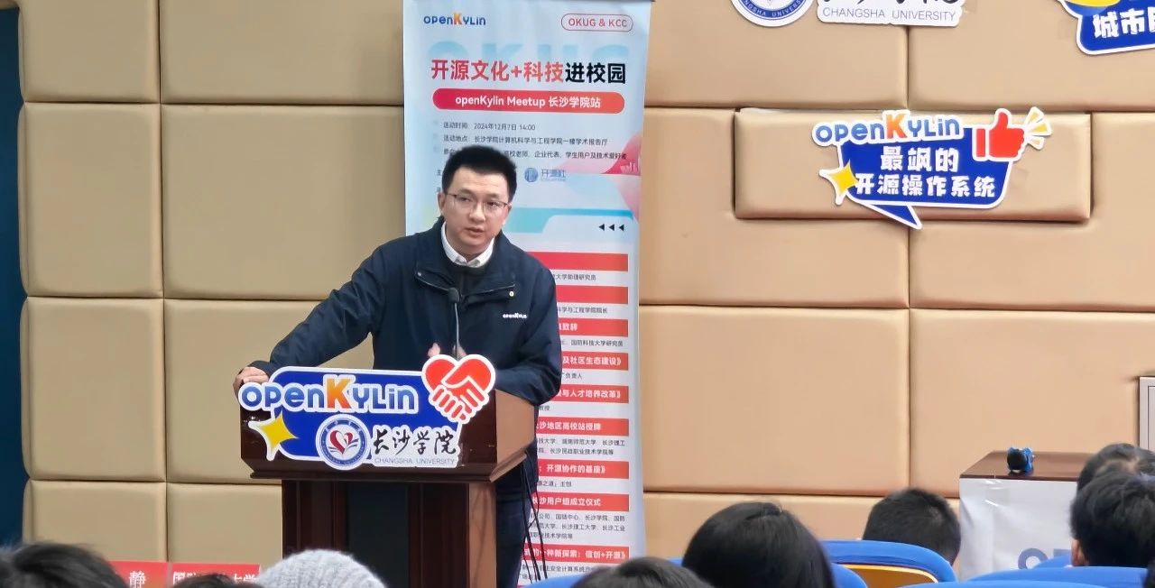 openKylin社区秘书长余杰在致辞中也表达了对此次活动的高度重视和殷切期望。他表示,很荣幸能在此次活动,和诸位相聚于此,共同探讨开源产业发展趋势。openKylin诞生于数字化浪潮之中,肩负着推动技术创新、促进产业升级的重任。社区满怀期待并信心十足地将与更多志同道合的伙伴紧密携手,并肩前行,也衷心期待每一位同学能在接下来的活动中,汲取到对自身成长和未来发展有益的养分。