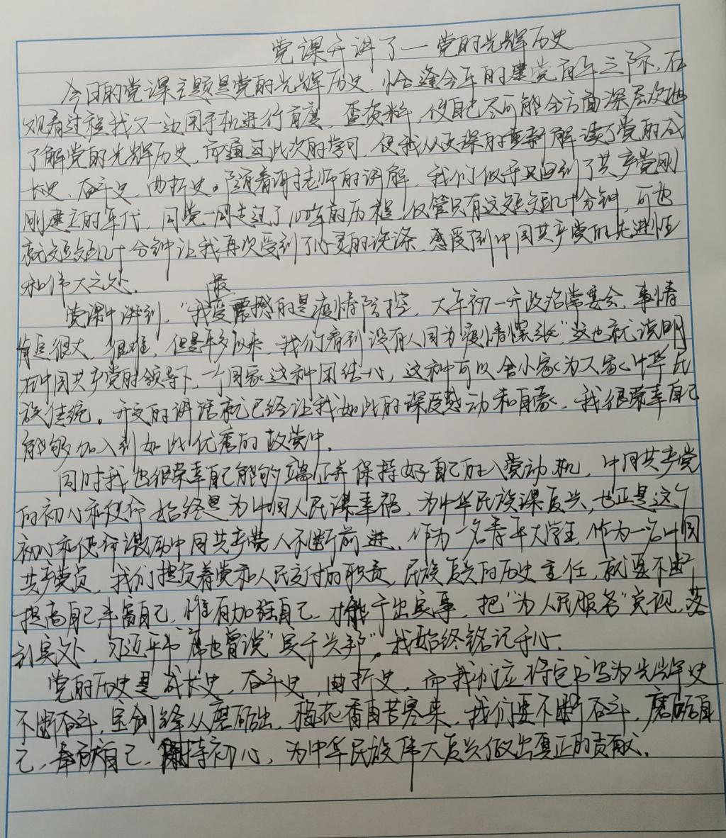 今天准时“搬好小凳子”就开始观看党课--党的光辉历程,整堂课听下看就能感受到从1921年中国共产党成立到1949年新中国成立再到今天的光辉岁月,党这一路走来给我们带来了很多,很荣幸自己能成为一名预备党员,在2020年疫情爆发的时候,党的领导果断正确,医护人员,党员同志和志愿军们冲在最前线,哪有什么岁月静好,只不过是有人在替我们负重前行,连线张定宇院长的时候,他把前线的情况跟我们介绍,多亏了党的决策和领导,中国能发展到现在的繁荣,与中国共产党的领导密不可分,在去年,在做上百万基数的核酸检测时需要十天,再到今年疫情复发,同样大的基数,核酸检测只需要三天,这一数据背后是中国共产党和中国人民的共同努力,万分荣幸生在国旗下,长在春风里,人民有信仰,国家有力量。其中又谈及了入党动机,许多人的入党动机都是想党能为我们提供什么,其实我最开始的动机也是这样的,那是因为不了解党,很荣幸,在这两年多对党的了解,我的动机也发生着改变,正如校长而言,党员的入党动机从始至终都应该是奉献而不是索取,全心全意为人民服务,为国家服务,全身心的奉献自己,如今的和平年代不需要我们上前线杀敌、牺牲,而是在国家和人民有困难的时候挺身而出。十分荣幸,成为华夏儿女。