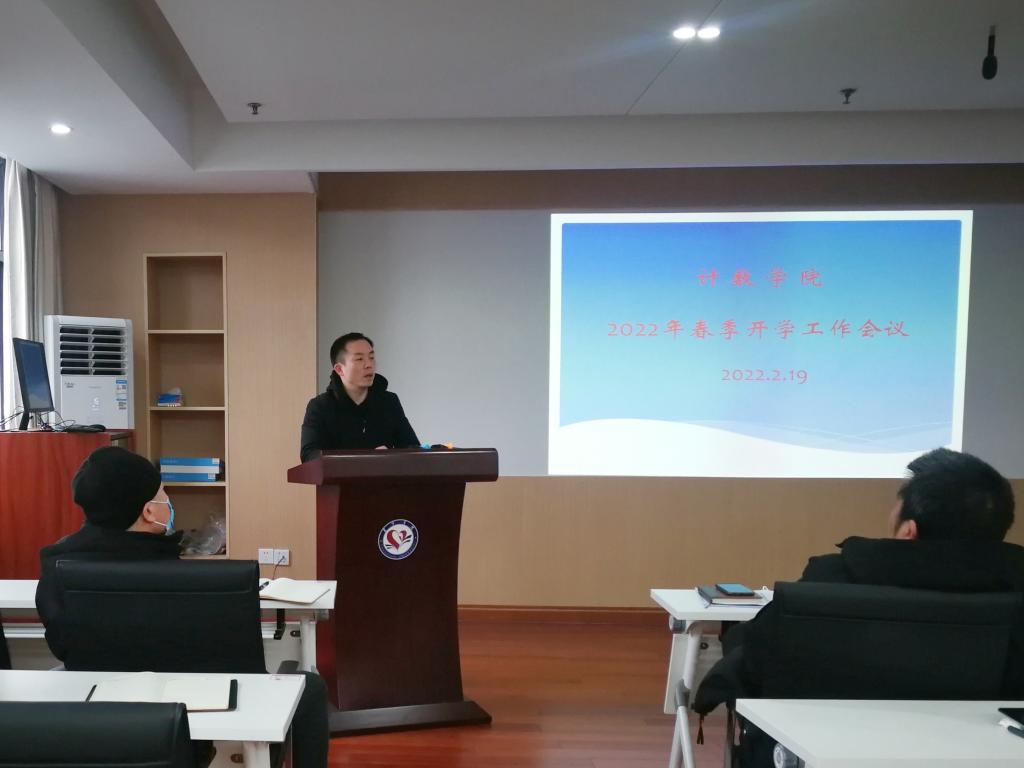 2022年2月19日下午,计算机工程与应用数学学院在致远楼1610召开新学期工作会议。院党总支书记曾一兵主持召开会议,院长李方敏、教学副院长何文德、科研副院长赵碧海、党总支副书记廖良梅、教研室主任、实验室主任及全体教职工参加会议。