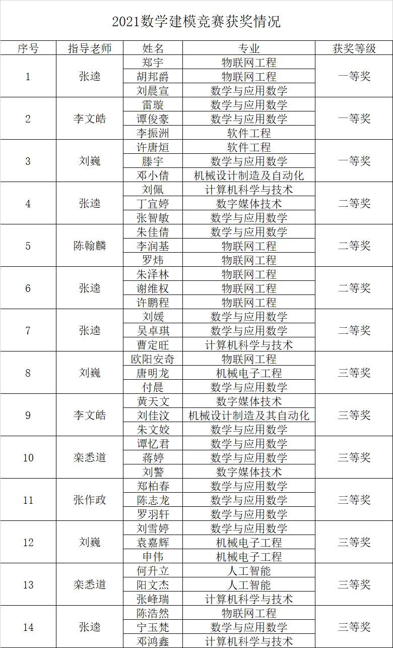 10月9日,2021年湖南省大学生数学建模竞赛暨全国大学生数学建模竞赛湖南赛区比赛评审结果揭晓,由我校计算机工程与应用数学学院组织参赛的队伍喜获省一等奖3项,省二等奖4项,省三等奖7项。