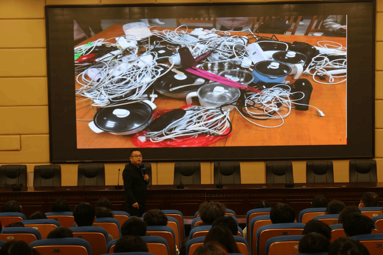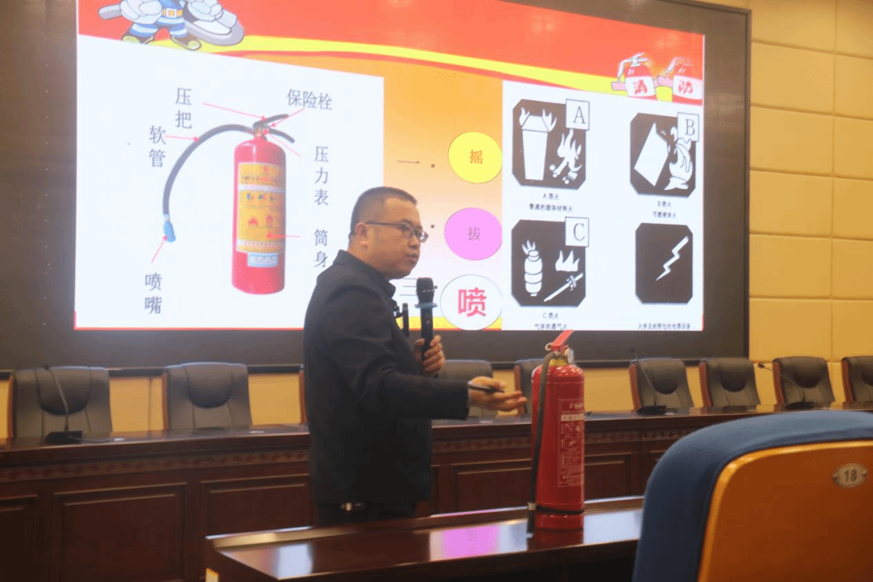 活动以“案例剖析+理论讲解+实操示范”开展,助力师生系统掌握消防安全知识与应急处置技能。陈福教官聚焦大学生群体,分享某高校学生寝室违规使用电器火势蔓延全寝室的案例,结合现场图片解析危害,并通过事故整改追责细节,强化“安全无小事,责任大于天”的理念,筑牢师生安全主体责任意识。