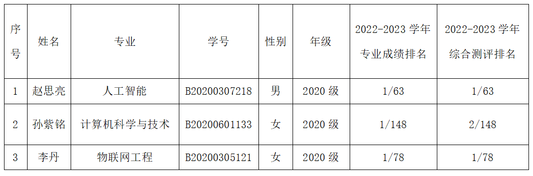 根据《关于开展2022-2023年国家奖学金评审工作的通知》(长大学工通[2023]19号)文件精神,经学生本人申请、学院资格审查、个人现场答辩、评委综合评议,学院拟推荐赵思亮、孙紫铭、李丹等3位学生申报2022-2023年国家奖学金,现将拟推荐名单予以公示。公示时间: 2023年9月21日-9月28日。如有异议,请于公示期内与计算机科学与工程学院学生工作办公室联系,联系电话0731-84261477(郑老师)。