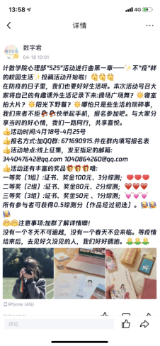 此次活动立足本院,放眼全校,通过心理委员例会、微信推送、宣传说说等方式宣传,参与者自主加入活动群并填写报名表参加。活动旨在锻炼学生处于不同环境下的思考能力和处事能力,让更多人了解到在疫情之下的大学生,也一直拥有着多彩的生活和有趣的灵魂。活动的参与者需按照活动群里所规定的要求进行投稿。参与者需以《封校后,我们...》为题,并在文档下方给予尾椎补充说明题目,通过文字、图片、视频等形式来描述疫情之下不同于他人的课余生活。并在活动截止日期前提交作品至计数学院心理部负责人处。后期由计数学院心理部统计整理,并评选出优秀的投稿作品。此次活动参与人数达到接近400人,活动期间,计数学院心理部一共收到了300多份投稿作品。在这看似枯燥无味的校园生活中,长大学子一起发现美好,分享美好,使在校生活焕发出了“不‘疫’样”色彩。
