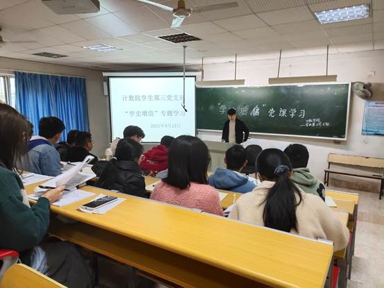 2021年4月13日下午,长沙学院计算机工程与应用数学学院学生各党支部有序开展学党史第二个专题“学史增信”的学习研讨,各学生支部通过多形式的集中研讨,支部书记带头学,学生党员分头领学,注重从“9个方面”增信,切实巩固第一专题的学习成果,保证学习成果转化为推动进步发展的成效。